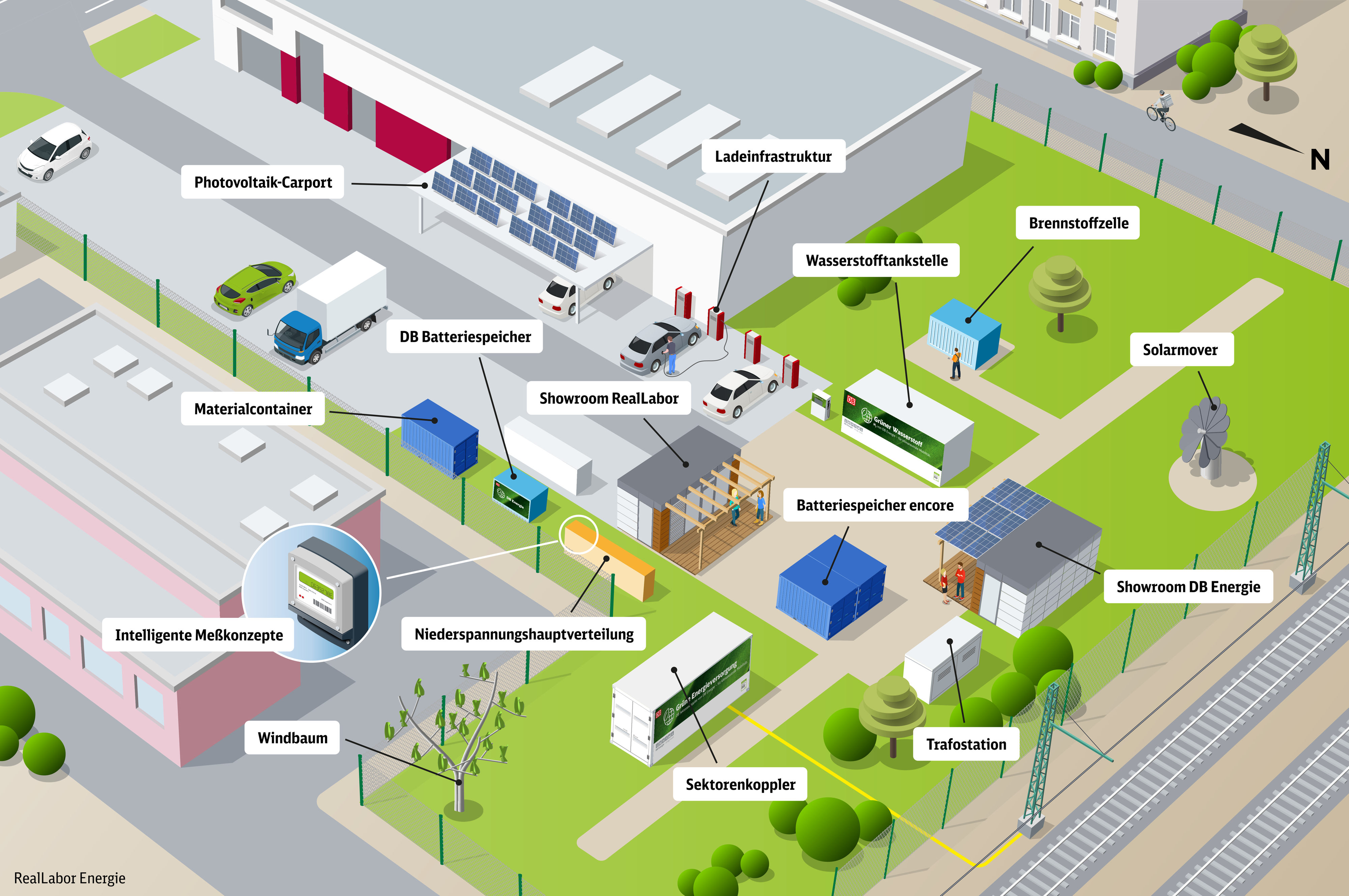 Das RealLabor Energie ist ein von DB Energie initiiertes Projekt mit dem Ziel, Technologien für eine erfolgreiche Energiewende zu entwickeln und zu erproben. Es leistet damit einen sichtbaren Beitrag zum Klimaschutz in der DB. Außerdem wird hier ein Ort zur Vernetzung geschaffen, an dem gemeinsam neue Use-Cases entwickelt und getestet werden.